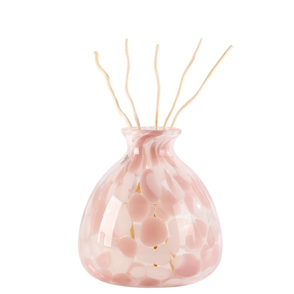 Pink semi-transparent glass bottle with rattan fragrance diffuser. Fragrance diffusers have two bottles styles: cylindrical and conical with the same 250mL content volume.